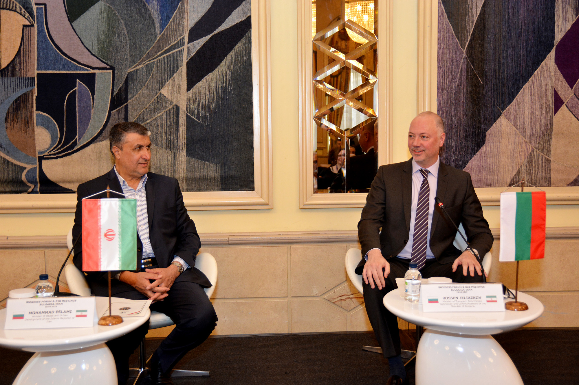 Сесията включваше и бизнес форум между предприемачите на Иран и България, организиран от правителството на Бойко Борисов. Както се вижда в сайта на Министерството на транспорта, информационните технологии и съобщенията (МТИТС), цели три прессъобщения има на 18 – 19 април за провежданите заседания с участие на министъра Росен Желязков и неговия колега от Близкия изток – министъра на пътищата и градоустройството на Иран Мохаммад Еслами.