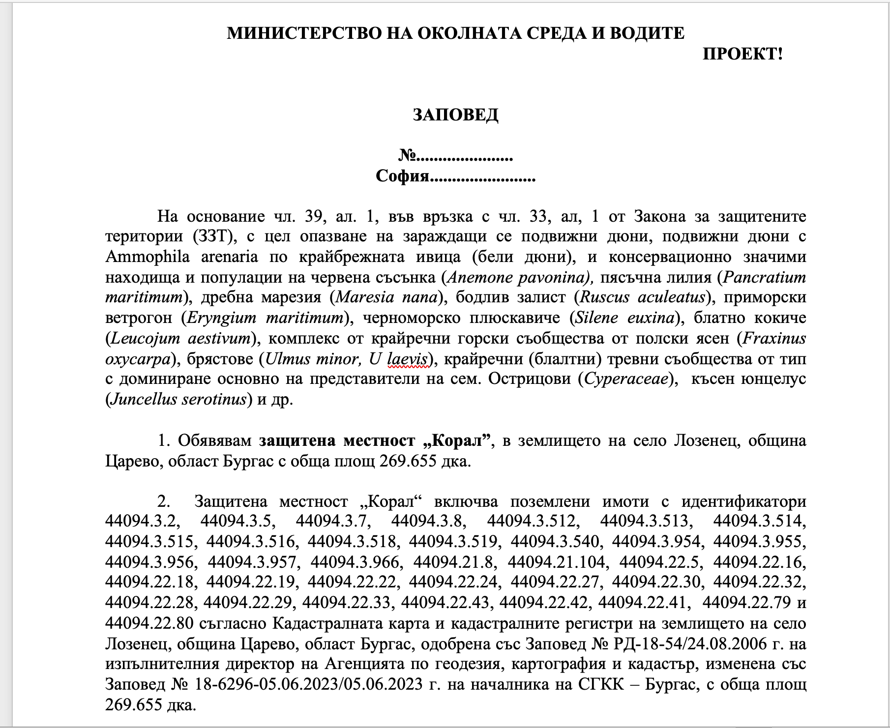 На пръв поглед, правителството на Николай Денков е на път да защити “Корал”. Министърът на околната среда и водите Юлиан Попов е подготвил проекторешение за обявяване на защитената територия “Корал”, с което “Биволъ” разполага (вижте долу).