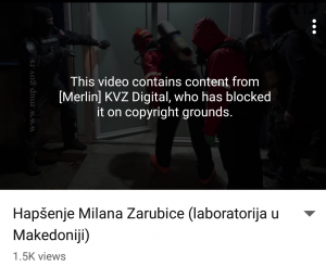 Днес обаче има нов инцидент: KVZ е блокирала видео в канала на нашия сръбски партньор, разследващия сайт KRIK.rs. Става дума за снимки от полицейска акция по разбиване на нарколаборатория, които са разпространени от полицията до медиите и няма как да бъдат обект на авторско право.