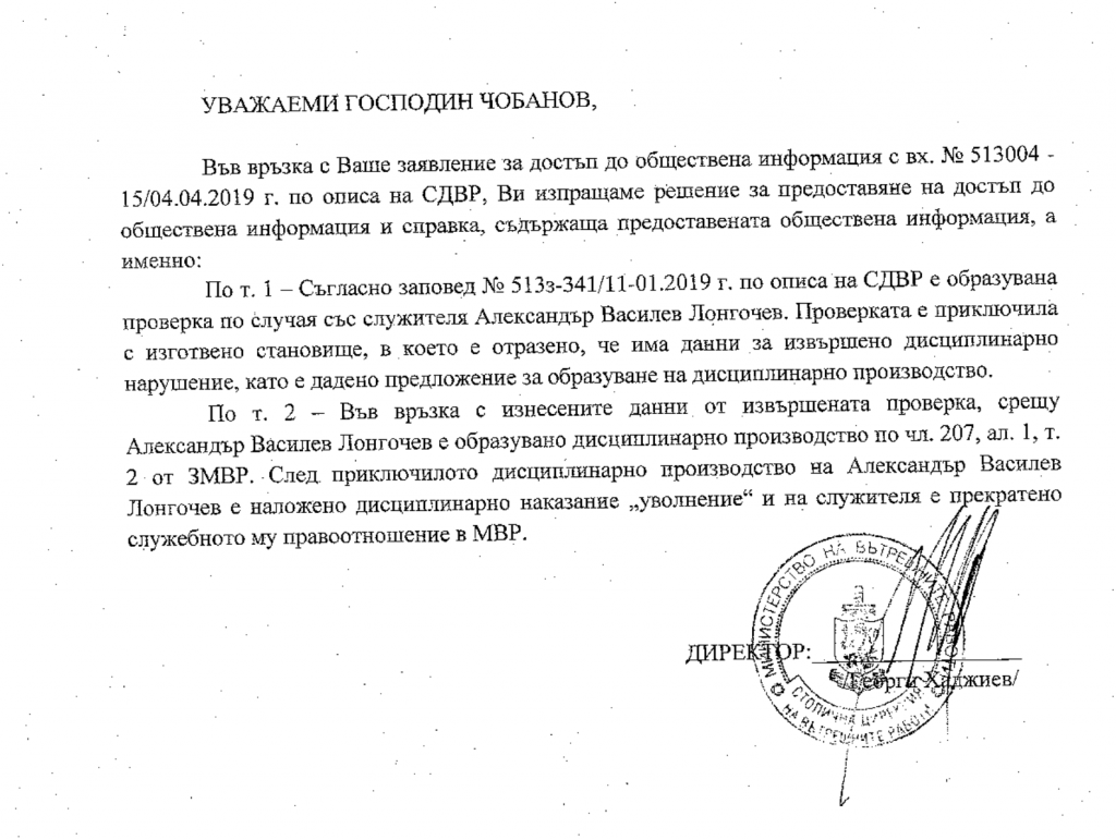 След няколко настойчиви въпроса на Биволъ до МВР, включително и по ЗДОИ, се получи отговор, че след извършена проверка срещу него е образувано дисциплинарно производство и той е уволнен.