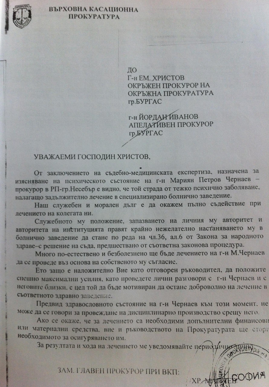През 2003 г, когато главният прокурор Филчев е превърнал прокуратурата в “терористична организация”, неговият заместник Христо Манчев трябва да реши казус с негов колега от Несебър – прокурор Мариян Чернаев. След поредица словесни и физически нападения от страна на Чернаев над органите на реда се стига до преписка за дисциплинарно производство, а на Чернаев е назначена съдебно-психиатрична експертиза. Заключението на вещото лице е, че Чернаев страда от “Биполарно афективно разстройство маниен епизод гневно маниен синдром”. Болният “може да извърши престъпление от значителна обществена опасност”, “представлява опасност за близките си и околните” и е необходимо да се проведе стационарно лечение в затворено психиатрично заведение (виж приложените документи).