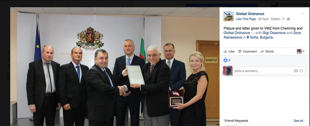 Бележка от редакцията на Биволъ: На една от снимките публикуквани в профила на фирмата Global Ordnance, която е на бившия обвиняем за подкупи Моралес, се вижда кабинета на Министъра в Министерството на икономиката. Божидар Лукарски присъства на връчване на плакет и грамота от Global Ordnance и Chemring за ВМЗ Сопот.