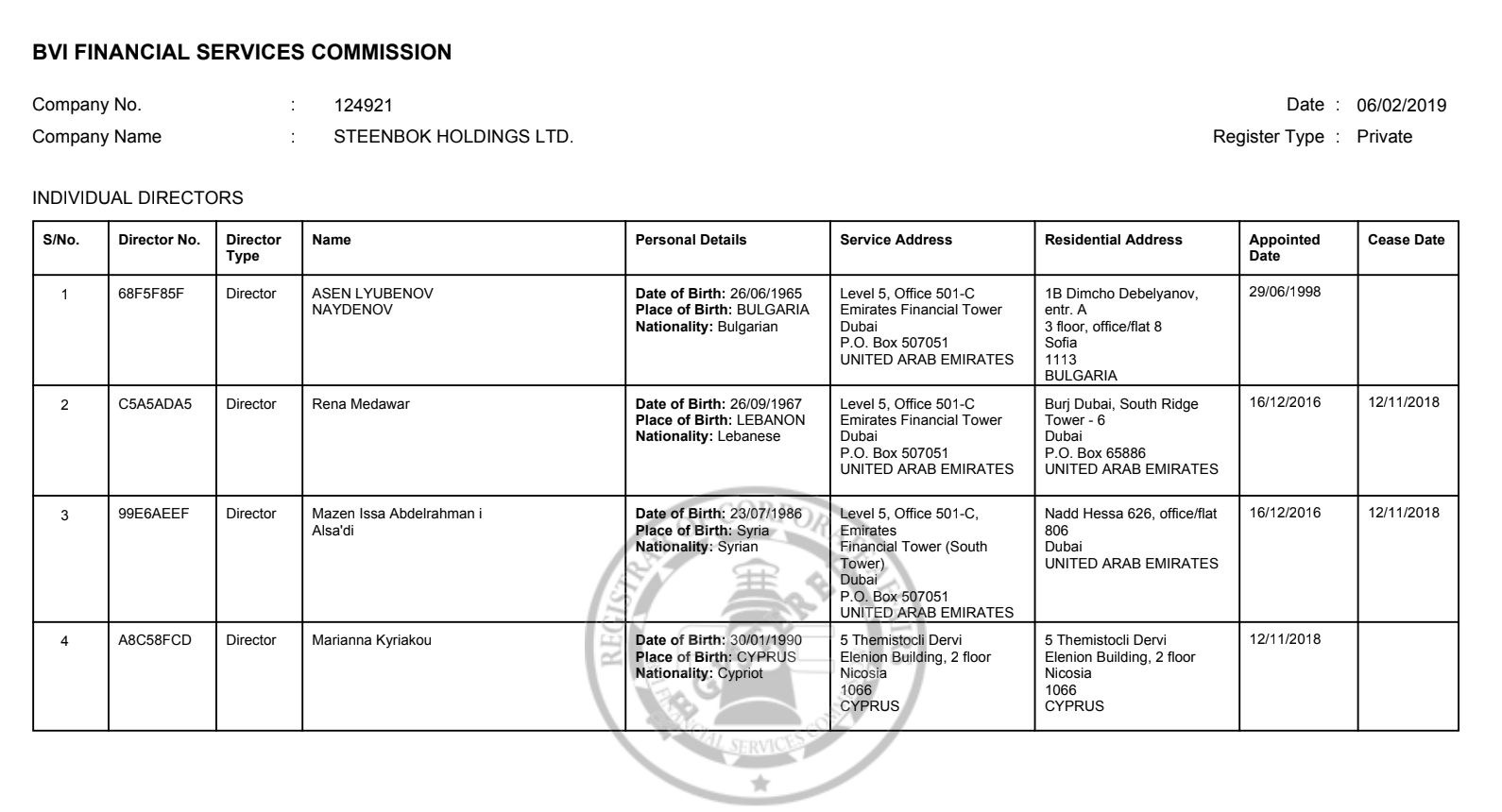 Проверка в Търговския регистър показва, че Найденов се явява представител на няколко кипърски фирми свързани с фирмите на Златев и неговия баща – “Тера Уей Холдинг Лимитид” и “Агриуей Холдингс Лимитед”. Там обаче липсва информация за офшорката “Стийнбок Холдингс”, която също се управлява от Найденов. Това се установява от Панамските документи и Документите Пандора, в които има и факсимиле от паспорта на финансиста. Вижда се, че за контакт с Найденов и другите директори има адреси както в Кипър, така и в Дубай.