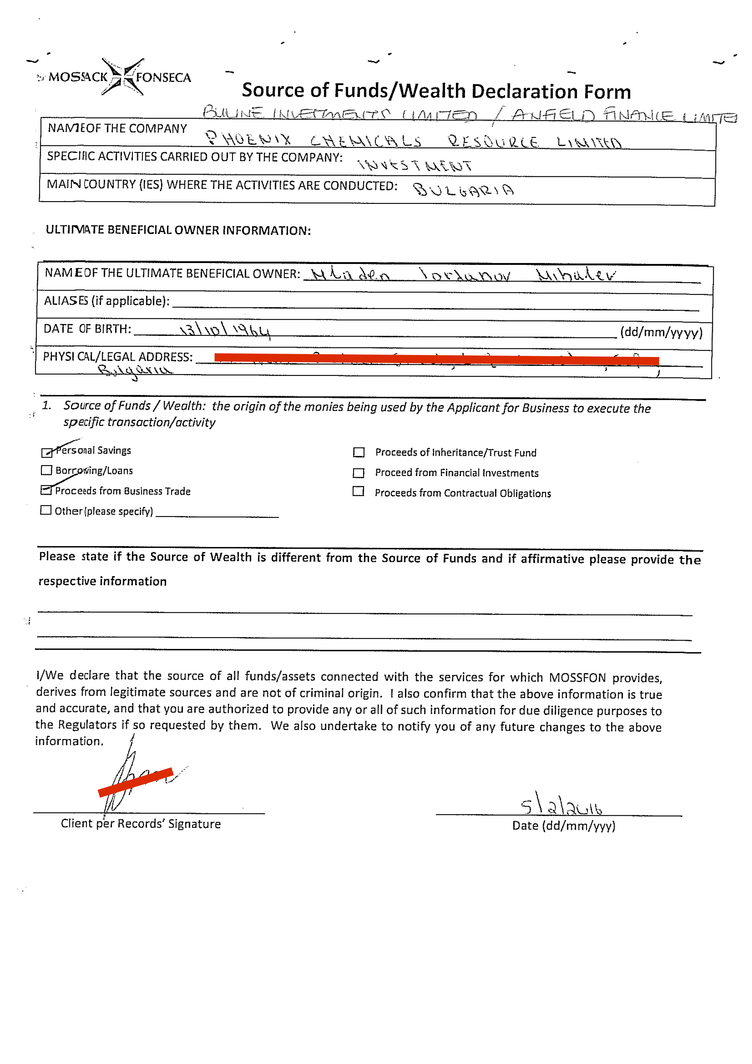 Писмо с което офшорните адвокати от Mossack уведомяват, че са получили документите на реалния собственик на Phoenix Chemicals – Младен Михалев.Това е уредено с така наречения “контра летър” – документ, удостоверяващ, че номиналният собственик OMNI Capital Assets Ltd. не е реален такъв.
