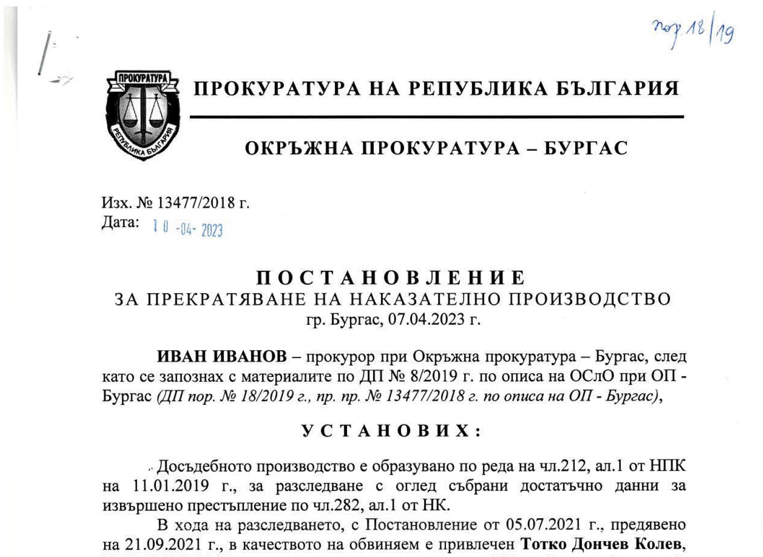 Постановлението за прекратяване на наказателното дело срещу ЧСИ Тотко Колев.След като първоначалният план на похитителите не успя, либийския танкер смени няколко пъти собствениците с различни офшорни фирми и накрая придоби израелски флаг под името “Мириам Б”. “Пиратите” обаче остават същите. Това са лица свързани със сметопочистващата фирма “Титан”, фаворит на ГЕРБ, и “швейцарския” банкер на Държавна сигурност Цветан Цанев.