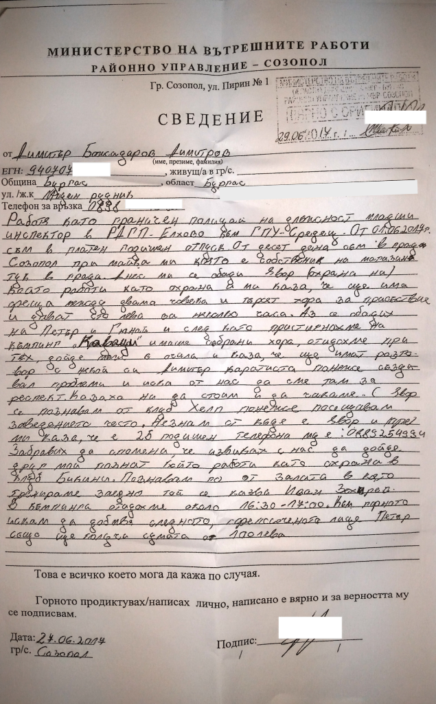 Работя като граничен полицай на длъжност младши инспектор в РДГП – Елхово към ГПУ – Средец. От 01.06.2017 г. съм в платен годишен отпуск. От десет дена съм в град Созопол при майка ми която е собственик на магазин тук в града. Днес ми се обади Явор (охрана на) който работи като охрана и ми каза, че ще има среща между двама човека и търсят хора за присъствие и дават сто лева за няколко часа. Аз се обадих на Петър и Гюнай и след като пристигнахме на къмпинг Каваци имаше събрани хора, отидохме при тях, дойде мъж с очила и каза, че ще имат разговор с някой си Димитър Каратиста понеже създавал проблеми и иска от нас да сме там за респект. Казаха ни да стоим и да чакаме. С Явор се познавам от клуб Хелп понеже посещавам заведението често. Незнам от къде е Явор и преди ми каза, че е 25 годишен. Телефона му е 0889….. Забравих да спомена, че извиках с нас да дойде друг мой познат който работи като охрана в клуб Бикини. Познавам го от залата в която тренираме заедно той се казва Иван Захариев. В къмпинга отидохме около 16:30 – 17:00. Към горното искам да добавя следното, горепосоченото лице Петър също ще получи сумата от 100 лева. Това е всичко, което мога да кажа по случая. Горното написах лично, написано е вярно и за верността му се подписвам. Дата: 27.06.2017 Гр. Созопол Подпис: не се чете