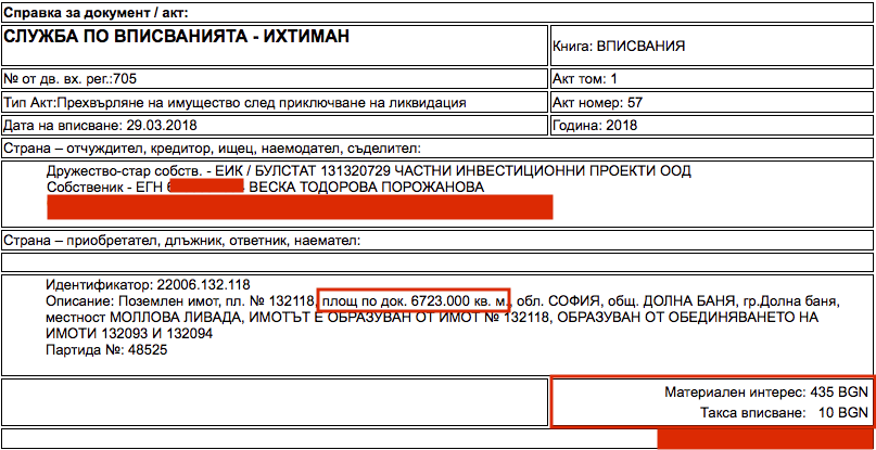 Още повече, че малко след това Веска е извършила и втора продажба с още по-голяма печалба на втория апартамент. Тъй като сделката обаче е в началото на следващата календарна година – 2018, още не можем да видим дали тя ще бъде отразена в имуществената декларация на Порожанов. Биволъ разкри и още една “симулативна сделка” на Порожанова и нейната фирма от 2018-та година. Там случаят е още по-драстичен, тъй като Веска е купила парцел около гр. Долна Баня от 6.723 дка за невероятната цена от 6 стотинки квадратния метър! Отново от своята фирма. Там разликата с пазарните цени, на които в момента се търгуват земеделските земи в района е ….500 пъти!!