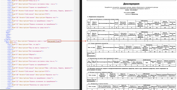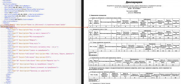 Декларациите сe подават от уеб сървъра на КПКОНПИ в езика XML с допълнителен файл за стил decl1.xsl, който форматира показването на полетата и таблиците. За всяка таблица или има нещо декларирано, или се показва текст “Нямам нищо за деклариране”. Този текст не присъства в xml файла, а се вкарва в края на всяка таблица при директива Declared=”False”. Ако Declared=”True”, той не се отпечатва.