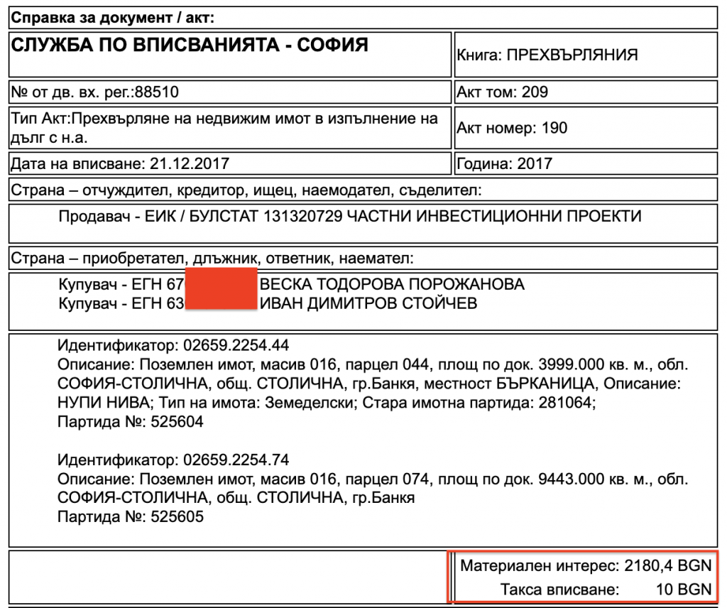Посоченото от Порожанов в декларацията на хартия не съответства на информацията от имотния регистър, установи проверка на Биволъ. Конкретно става дума за два поземлени парцела с обща площ над 13 декара, от която Веска притежава 1/2 идеална част, оценена на 95 075 лв. Не става ясно дали това е пълната цена или на толкова е оценена само частта, която се пада на Порожанова.