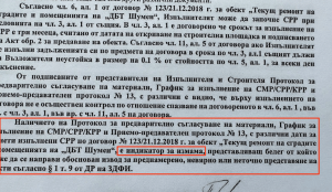 “МБ Инженеринг СМР” – стр. 34, покана само до един участник. Напълно нагласена история. Договор 516 хил. лв. без ДДС. Платено, а не извършена работа за т. 2.3.1 – 3856 лв. Търговище, 2.3.2 – 3458 лв, Разград, 2.3.3. 6 158 лв., – Русе.