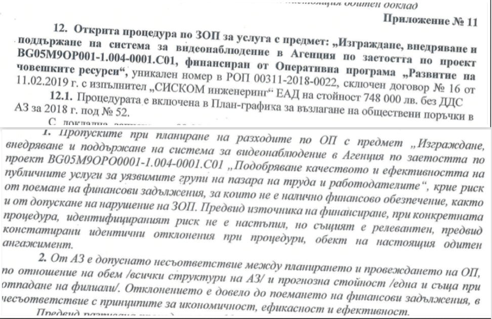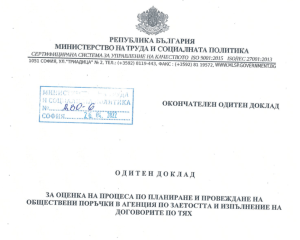 “В посочения период дирекция „Вътрешен одит“ на Министерството на труда и социалната политика е извършила одит (един – б.р.) за оценка на процеса на планиране и провеждане на обществените поръчки в Агенцията по заетостта и изпълнението на договорите по тях.”