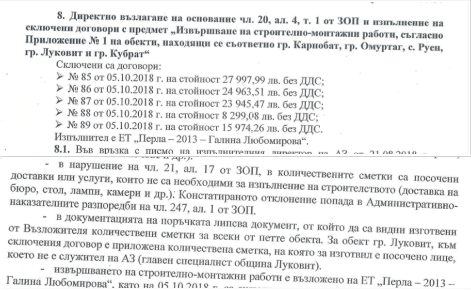 ЕТ Перла 2013 – Галина Александрова, стр. 56 – 36 хил. лв., директно възлагане. Гъсенични подемници, които не се използват и са в склада. А е било явно спешно да се купят.