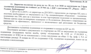 ЕТ Перла 2013 – Галина Александрова, стр. 53 – 69 хил. лв., събиране на оферти, условията на търга посочват ограничителни условия под формата нне отговаря на изискванията за търга. Целия търг е направен в полза на ЕТ Перла 2013.