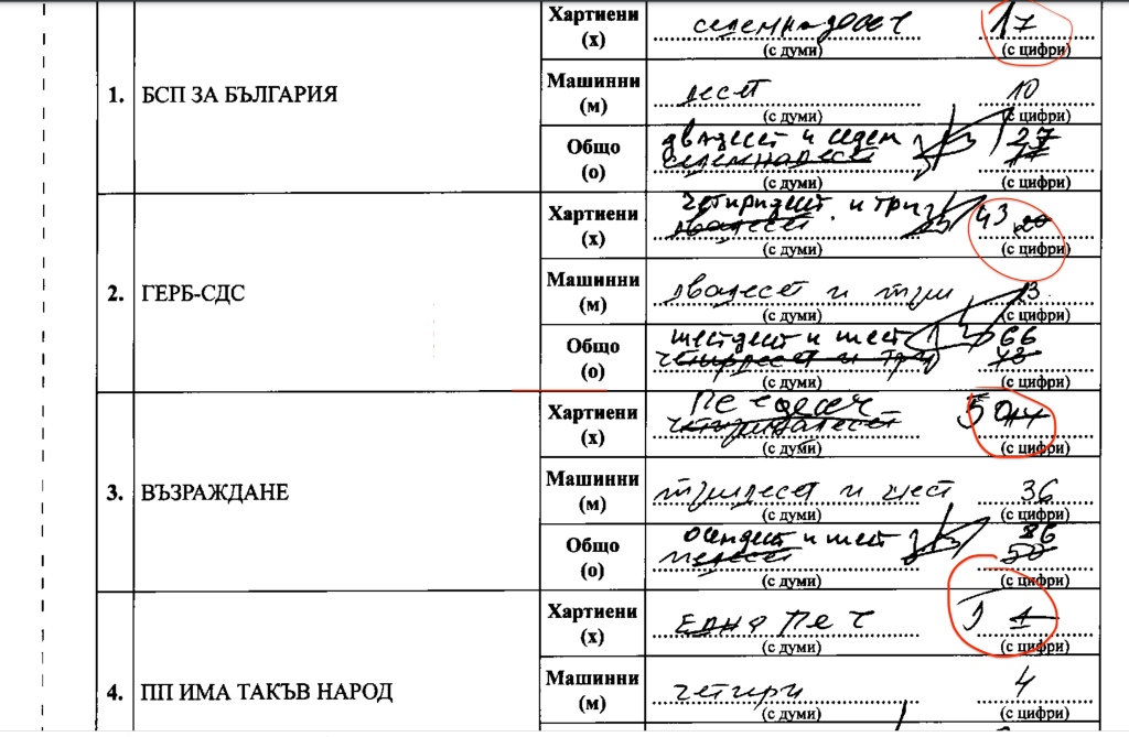 Така, в един от такива СИК членовете на РИК и служители на „Информационно обслужване“ дописват на места сами, на места карат председателя с неговия почерк, да добави гласове за няколко политически партии, естествено не и за неговата. Така, „шампионите“ стават „Възраждане“ с 36 надписани гласа. Следват ги ГЕРБ-СДС – с 23 надписани гласа. Десет гласа с „елегантното“ добавяне на единица към изписаната цифра 7 (така резултатът вече става 17) се подхвърлят на „БСП за България“.