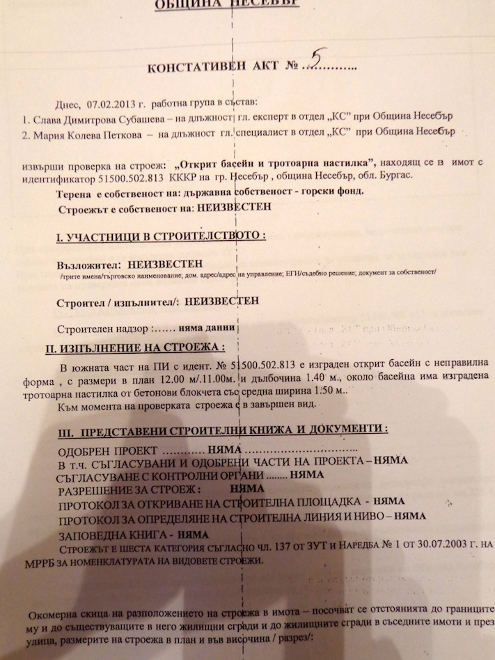 В началото на февруари 2013 инспекторите на Община Несебър констатират незаконните строежи. На 12.04.2013 кметът издава пет заповеди за премахване, които в момента се обжалват в съда от фирмата ЕКСПРЕС ТУРС ООД, която чрез фирмата ЕЛЕОНОРА ТРАНС е съсобственост на майката на Емил Димитров (72 годишната Елеонора Димитрова) и на бившия сикаджия Славян Теофилов.