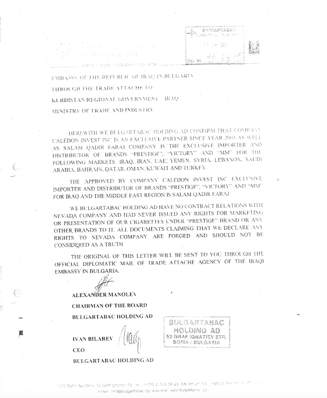 Биволъ направил в Таможенное агентство письмо, датированное 2011 г., с исходящим номером 49-28-15. Оно подписано бывшими руководителями холдинга «Булгартабак», и из него становится ясно, что еще до приватизации холдинг работал с компанией «Каледон Инвест» и ее представителем в странах Ближнего Востока Саламом Кадиром Фараджем, которого турецкие службы по борьбе с организованной преступностью считают контрабандистом (см. здесь). В Министерстве экономики, которое на тот момент руководило холдингом «Булгартабак», ответили на вопрос Биволъ, что такого письма у них не сохранилось.