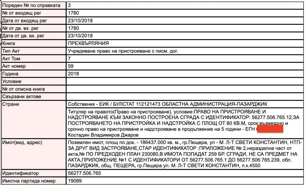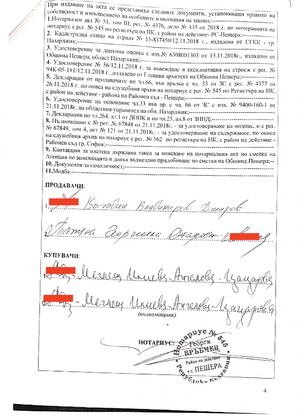Через три дня был подписан акт купли-продажи, по которому Джаров и его жена стали собственниками участка. Еще через две недели весь дом с пристройкой и надстройкой был зарегистрирован по Акту 16, получив Удостоверение № 56/12.11.2018 о вводе в эксплуатацию жилого здания с регистрационным номером 94К-05-1#1/12.11.2018, выданное главным архитектором общины Пештера. 26 ноября 2018 г. достроенная вилла была продана семье Цацаровых.