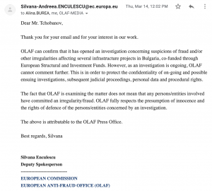 В прошлом месяце Биволъ получил от OLAF официальное подтверждение того, что служба ведет расследование нескольких инфраструктурных проектов, но для сохранения тайны следствия в OLAF отказались предоставить более подробную информацию.