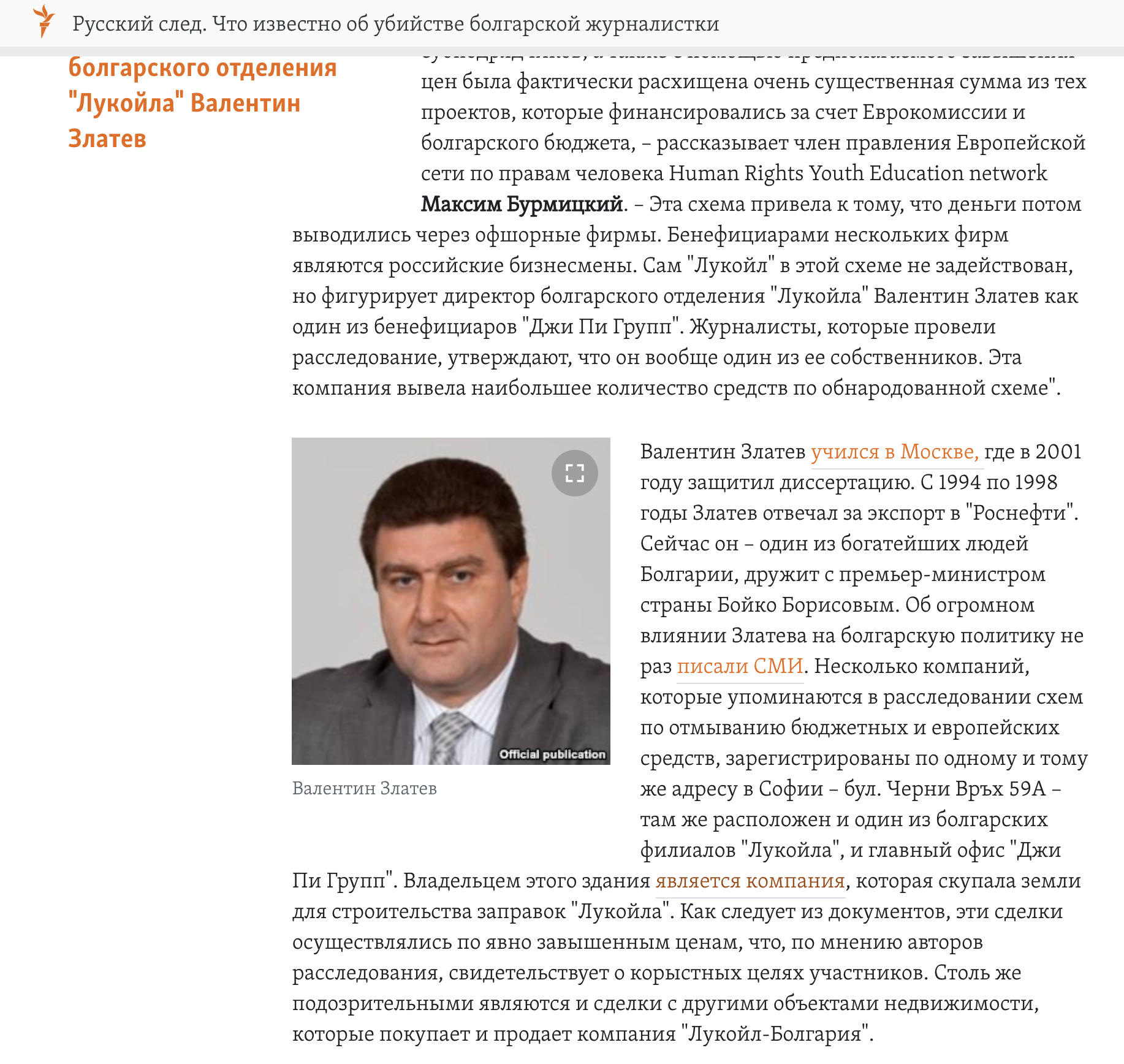 Имеются данные о том, что политический проект «Борисов», от его нахождения на посту мэра Софии до победы партии ГЕРБ на выборах, финансируется Златевым через средства, выведенные из «Лукойла». На это намекает и другой важный пассаж из того же доклада, имеющего наивысшую степень секретности в Госдепартаменте США.