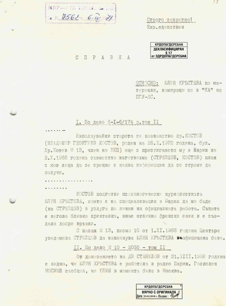 Преди да замине за Франция Юлия Кръстева е “профилактирана” от офицер в МВР и дава съгласие да бъде използвана от службата. След пет години същият офицер, подписан като “Петров” пътува до Париж и осъществява вербовката “на напълно доброволна основа в рамките на нейните възможности и при пълно нейно съзнание, желание и отговорност”. Кръстева заявява, че е съгласна а от сведението на “Петров” излиза, че вербовката е на идеологическа основа, а не на базата на натиск или компромат. Уговорено е Кръстева да поддържа връзка чрез “Любомиров” от посолството.