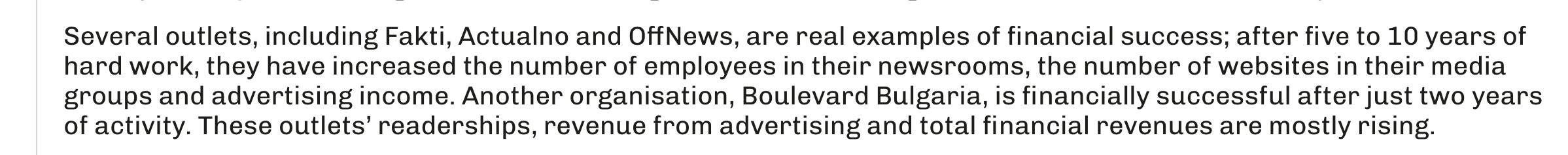 Като положителни примери за финансово израстване на медийния пазар в България, са посочени новинарските сайтове Actualno.com, OFFnews, “Факти” и “Булевард България”: “През годините те оцеляват и успяват да увеличат читателския интерес към себе си, съответно и рекламните си приходи”.