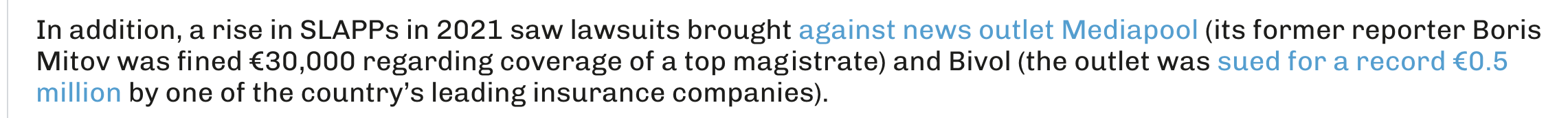 “Бяха заведени искове срещу Mediapool (бившият ѝ репортер Борис Митов беше глобен с 30 000 евро във връзка с отразяването на личното състояние на висш магистрат) и Bivol (медията е съдена за рекордните 0,5 млн. евро от една от водещите застрахователни компании в страната)”.