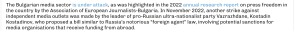 В доклада за медийната среда се припомня и опитът през миналата година от страна на проруската и крайнодясната политическа партия “Възраждане” да предложи законопроект, подобен на прословутия путинов закон за „чуждестранните агенти“ в Руската федерация. Този закон доведе до масови глоби за опозиционните медии в Русия, ако получават грантово финансиране или дарения финансиране от чужбина и де факто фалира много от тях или принуди с началото на войната в Украйна да се изнесат в Европа.