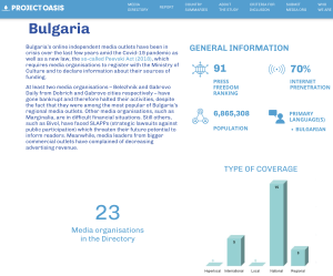 България е представена на интерактивната карта на Project Oasis Europe с цели 23 медийни организации, което я поставя на второ място след огромните като пазари Великобритания и Испания, където има по 25 профила на онлайн изданията.