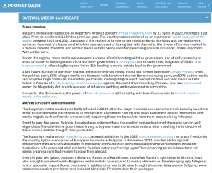 Цялостният анализ на медийната среда показва, че независимите онлайн медии в България са в криза през последните няколко години – на фона на пандемията от COVID-19, войната в Украйна и др. Припомня се, че през 2018 г. беше приет “убийственият за медиите” закон “Пеевски” – по силата на приетите тогава правила медийните организации са длъжни да се регистрират в регистър към Министерството на културата и да декларират подробна информация за всяко евро от източниците си на финансиране.