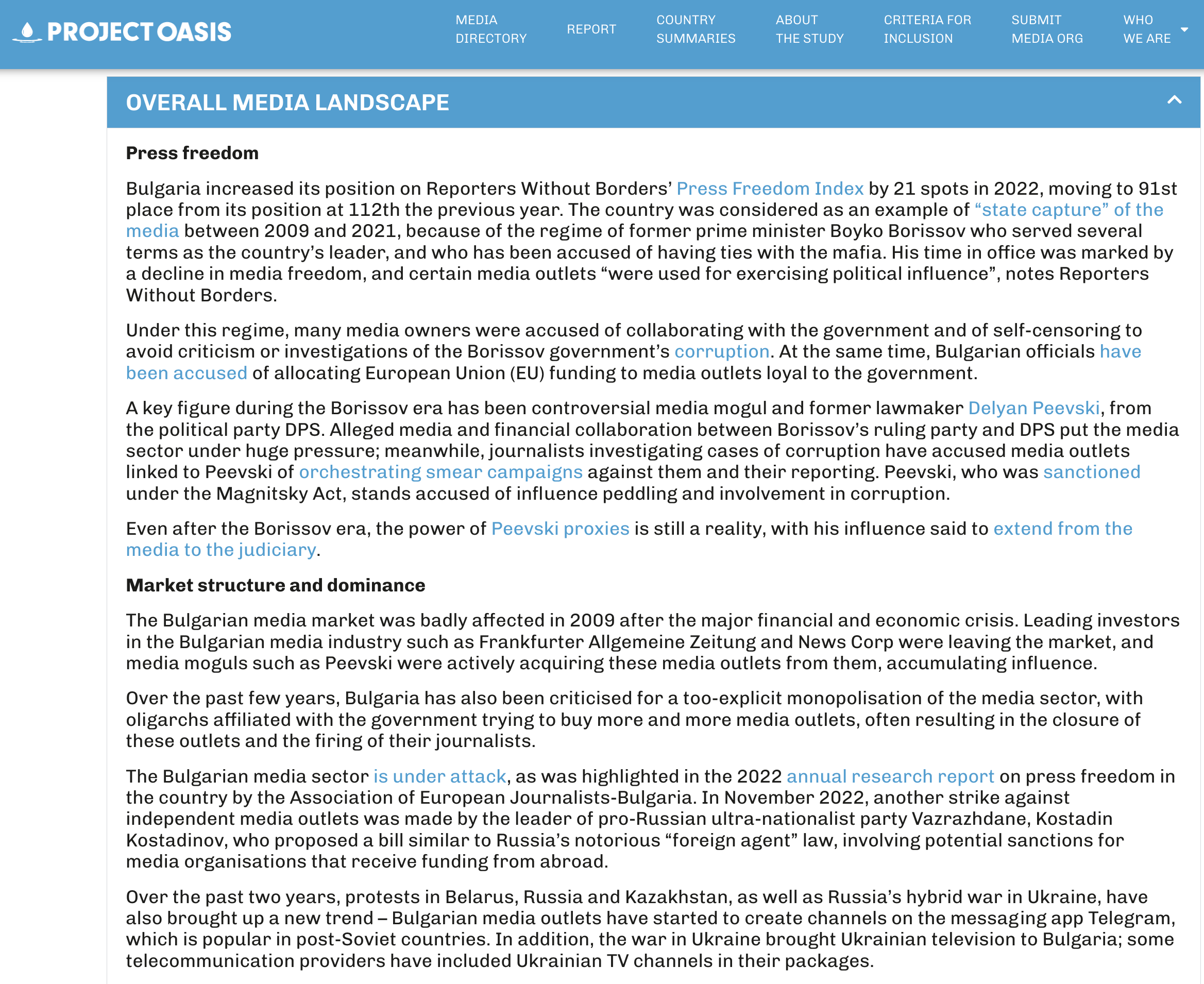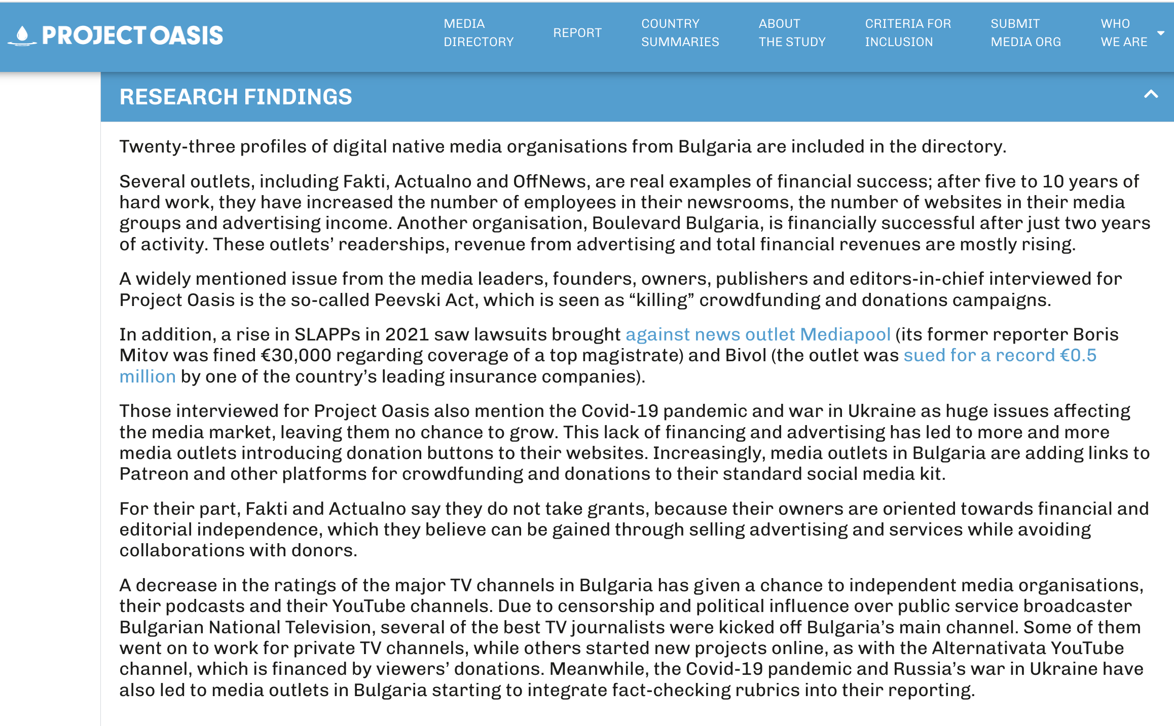 Съдебните атаки срещу две независими български медии – онлайн изданията “Биволъ” и Mediapool.bg са споменати в анализа на медийния пазар в България в международното изследване Project Oasis Europe. Едногодишният изследователски проект е за устойчивостта, иновациите и въздействието на независими дигитални новинарски организации в над 40 страни в Европа. Изследването е на НПО-то от Аржентина SembraMedia в сътрудничество с European Journalism Centre (EJC), International Media Support (IMS), Media and Journalism Research Center (MJRC), и Global Forum for Media Development (GFMD). Финансирано е от Google News Initiative (GNI).