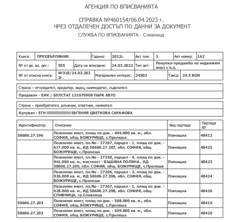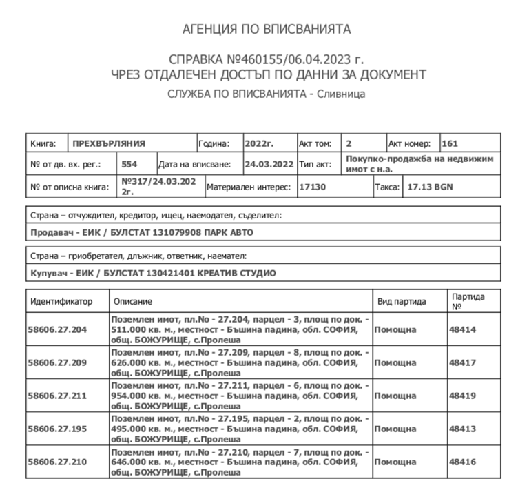 Продавач на всички тези имоти е фирмата “Парк Авто”, чийто съсобственик е Станимир Жарков – бивш общински съветник и кандидат-кмет от ГЕРБ в Божурище.