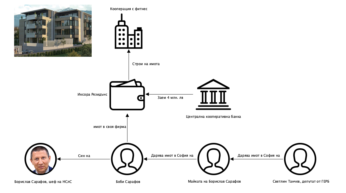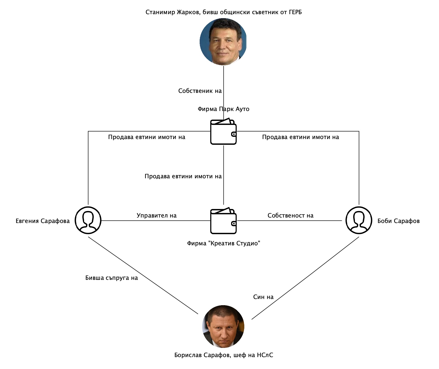 Синът, майката и бившата съпруга на шефа на Националната следствена служба Борислав Сарафов са станали едри строителни предприемачи. В основата на тяхното забогатяване стават дарение на скъп имот в София от бивш депутат на ГЕРБ и продажба за символична цена на парцели за строителство до Божурище от бивш общински съветник и кандидат кмет на ГЕРБ. Освен апетитни терени от политици, семейството придобива и жилищни имоти от лица, разследвани за пране на пари.