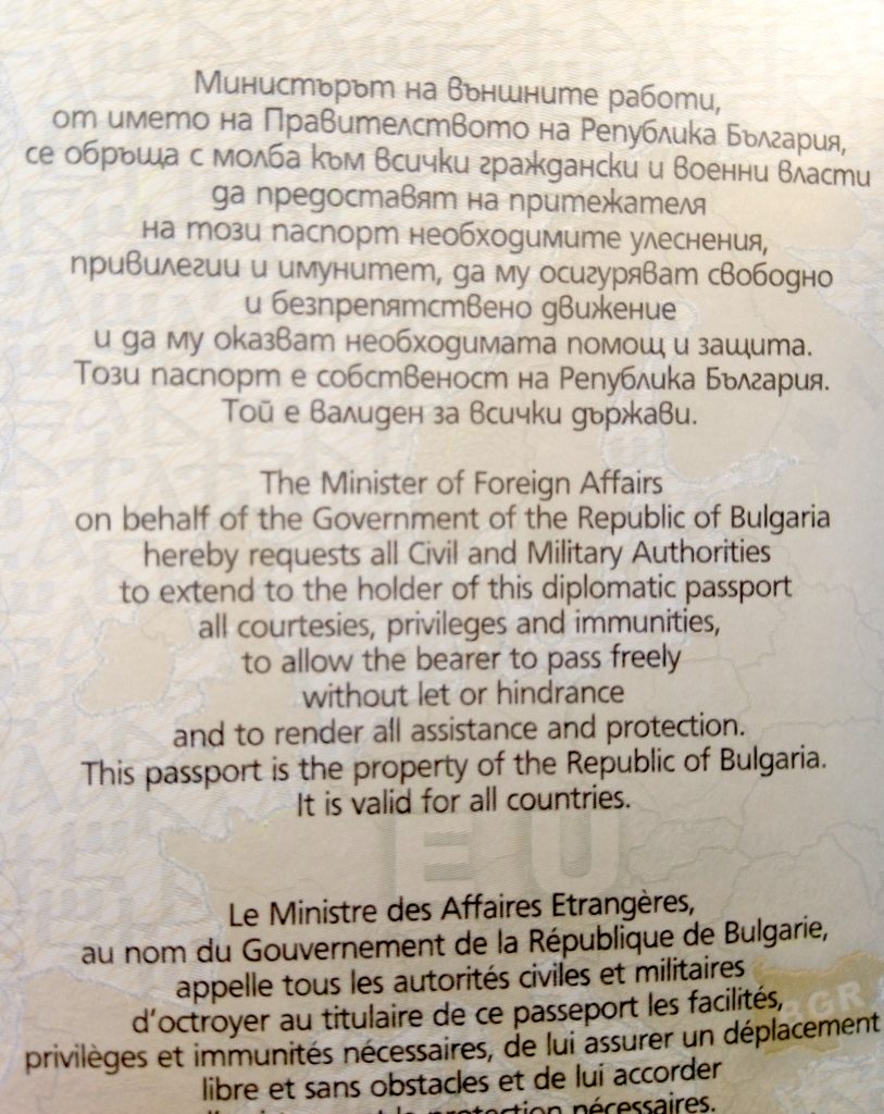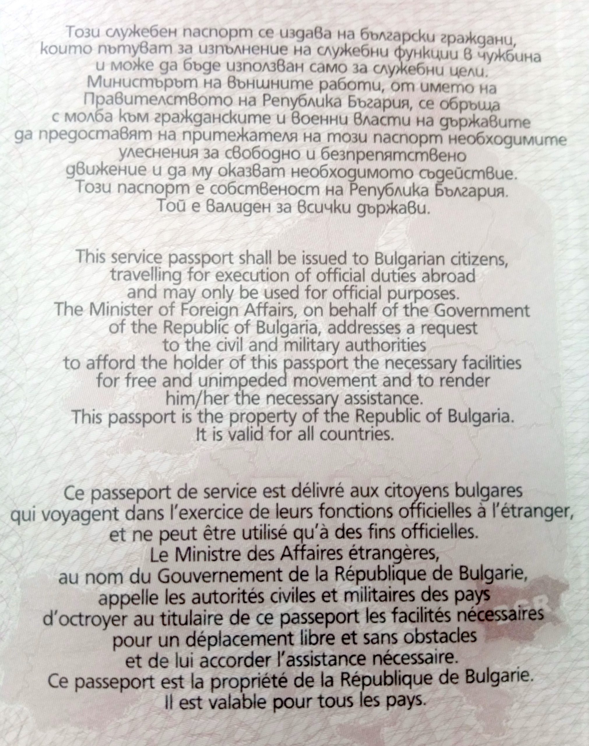Министърът на външните работи, от името на Правителството на Република България, се обръща с молба към гражданските и военните власти на държавите да предоставят на притежателя на този паспорт необходимите улеснения, привилегии и имунитет, да му осигуряват свободно и безпрепятствено движение и да му оказват необходимата помощ и защита.