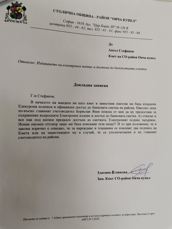 Друг окумент (вижте горе) е също Докладна записка. Този път тя е за взет под натиск достъп до бюджетна сметка. Както и за натиск да се даде на друго лице електронен подпис. Нищо не става в общината без знанието на кмета. Ето как той работи “в екип” и как “уважава” колегите си в районната администрация.