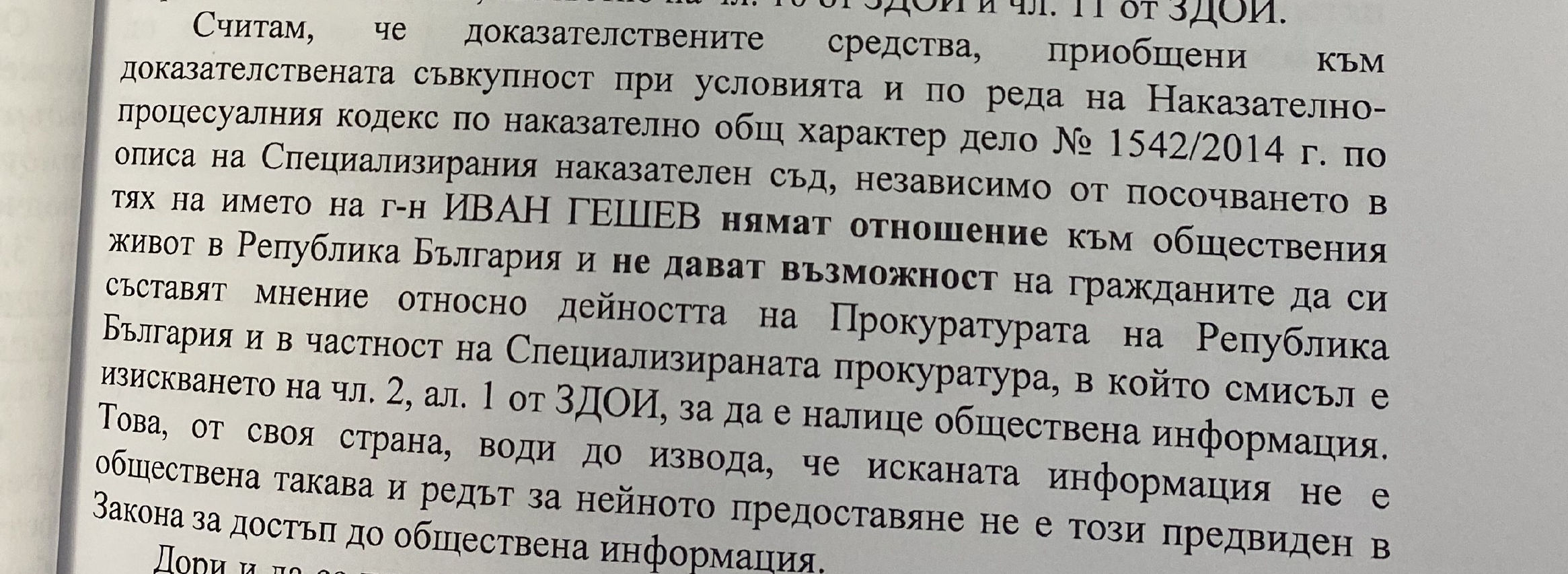 Най-фрапантното твърдение на прокуратурата изложено пред АССГ реално е, че споменаването на името на Гешев в контекста на тези 50.000 „няма отношение към обществения живот в Република България и не дава възможност на гражданите да си съставят мнение относно дейността на Прокуратурата на Република България и в частност на Специализираната Прокуратура“.