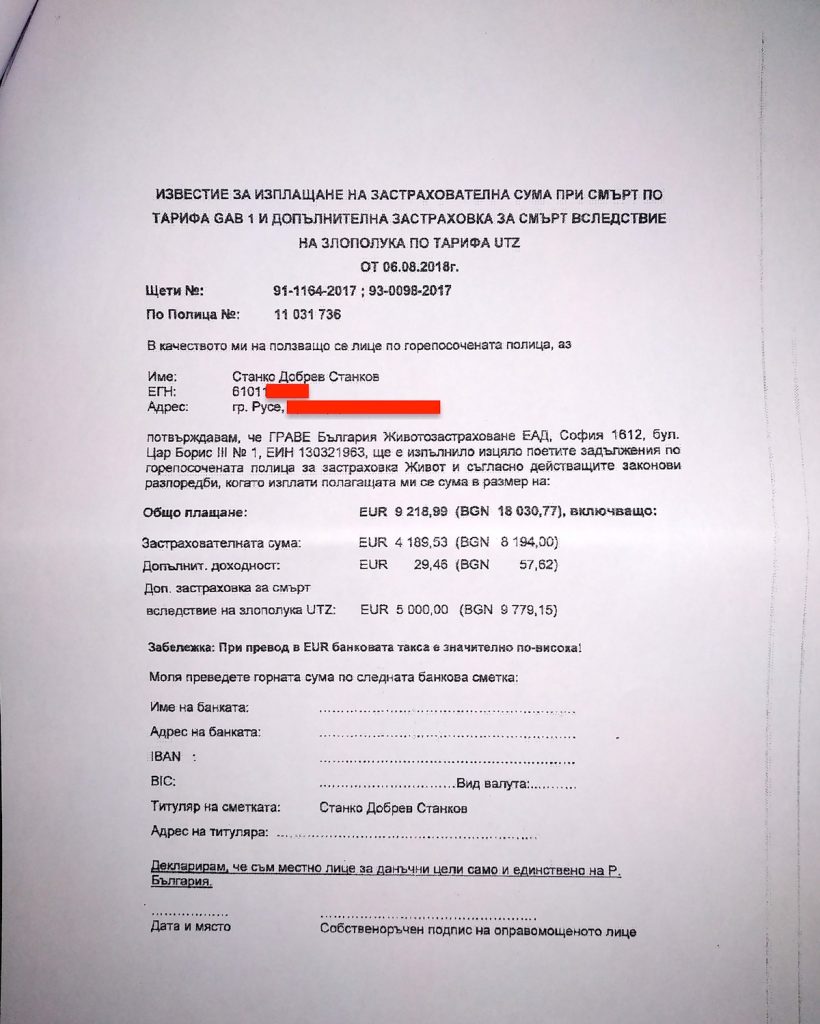– Има застраховка живот, една тяхна служителка ни каза. Той е имал застраховка трудова злополука и застраховка живот.