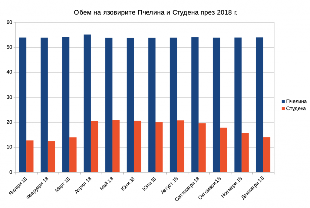 Следните графики и таблици са с данни от официалните месечни графици за водоползване на МОСВ. Те показват какво се случва с водата в Студена и Пчелина за периода януари 2018 – юли 2019 г., когато според разследването на Валя Ахчиева от Студена са изтекли 14,2 млн. куб. м. безотчетна вода.