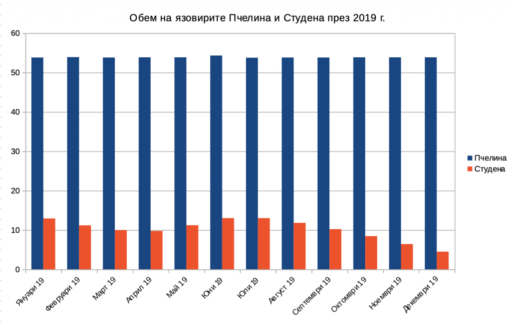 Вижда се, че Пчелина непрекъснато има ниво около и над 53,8 хил. куб. м., докато нивото в Студена варира. През 2019 г. се случва странен феномен. Средностатистически годината не е по-сушава, но през април в язовира не постъпва нищо спрямо 2018 г., когато язовира се увеличава с цели 7 милиона куб. м. вода. Все едно през 2019 г. изобщо не е имало снеготопене на Витоша.