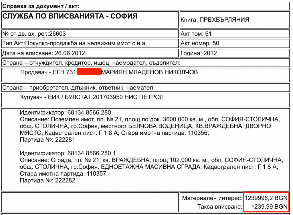 Именно статутът на тази земя, която както се вижда и от снимките и от сателитната карта, е на хълм в края на селото, прави цената ѝ смешно ниска в сравнение с годните за застрояване терени в близките до София квартали. На 24.11.2009 г. Николов и Джартова я купуват само за 700 лв. от частно лице.