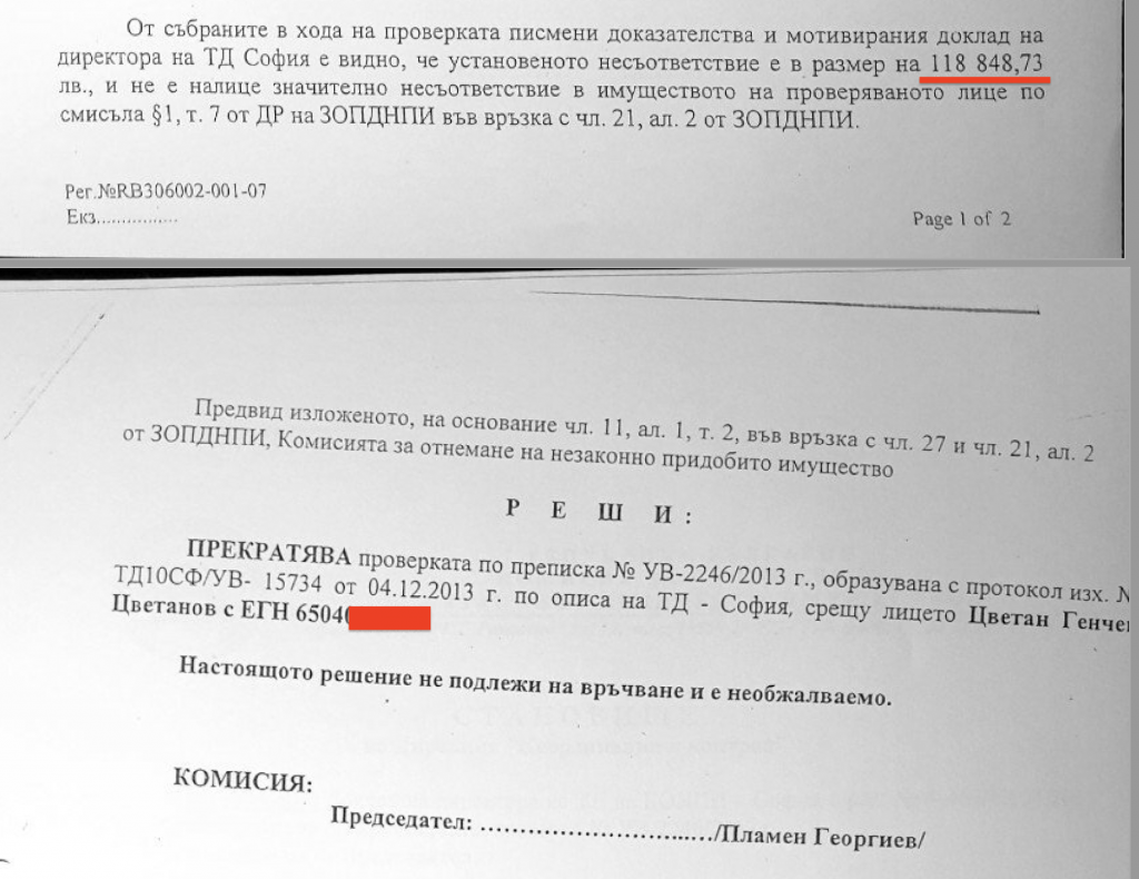 Проверка на КОНПИ срещу Цветан Цветанов приключила през 2015 г. е установила несъответствие в имуществото му от 119 000 лв., но е била прекратена, защото сумата не надвишава прага за конфискация от 250 000 лв. Това показват документи, изпратени до ГД “БОЕЦ”, които Биволъ анализира и потвърди от независим източник. От подробния доклад по преписка УВ-2492/2013 г. става ясно, че КОНПИ е нарушила грубо закона и е приложила различни счетоводни еквилибристики, за да сведе несъответствието само до 130 000 лв. Реалната сума на имуществото, за която Цветанов и семейството му не могат да докажат доходи е над 500 000 лв. изчисли Биволъ на базата на данните в доклада и открити източници на информация. В доклада има и данни от проверка на НАП, констатирала укриване на данъци в особено големи размери, за което обаче Цветанов не е обвинен.
