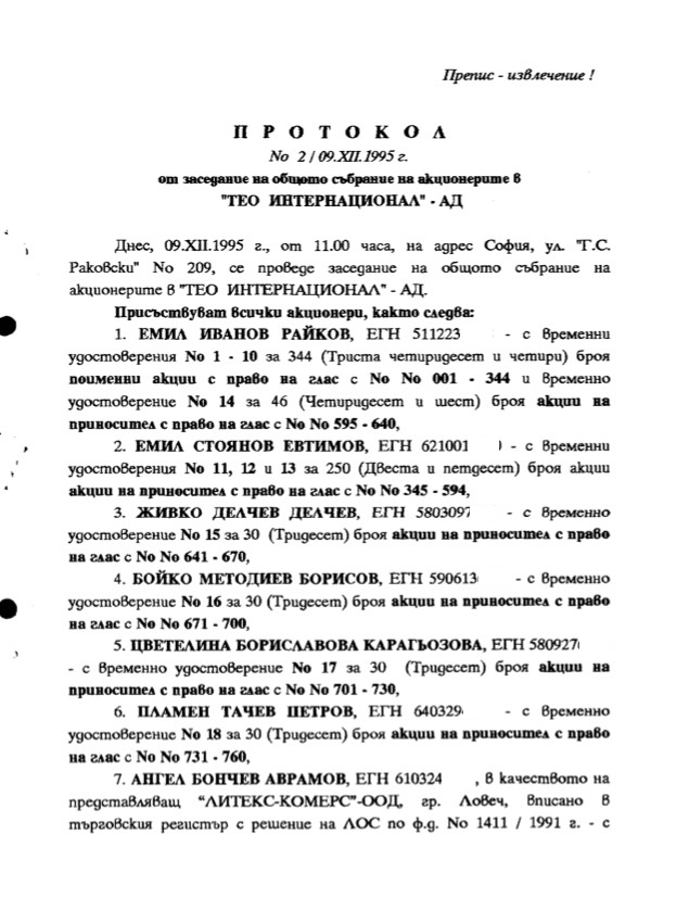 След разкриването на нелегалната манифактура основателят и основен акционер Емил Райков забягва в чужбина. “Тео Интернационал” обаче не прекратява своето съществуване. В края на 1995 г. Бойко Борисов и Пашата влизат в управителния съвет на фирмата, а след няколко месеца, през май 1996, като членове на борда ги заместват Иво Каменов от варненската групировка ТИМ и Недялко Кирезиев.