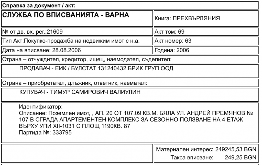 Неизвестно защо обаче в партидата на Валиулин няма данни за продажбата на тези апартаменти. Документът за продажбата се открива в Имотния регистър единствено по данните, с които сделката е вписана в Кадастъра, но не и с търсене по имената на лицето.