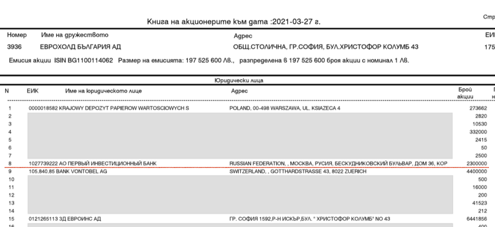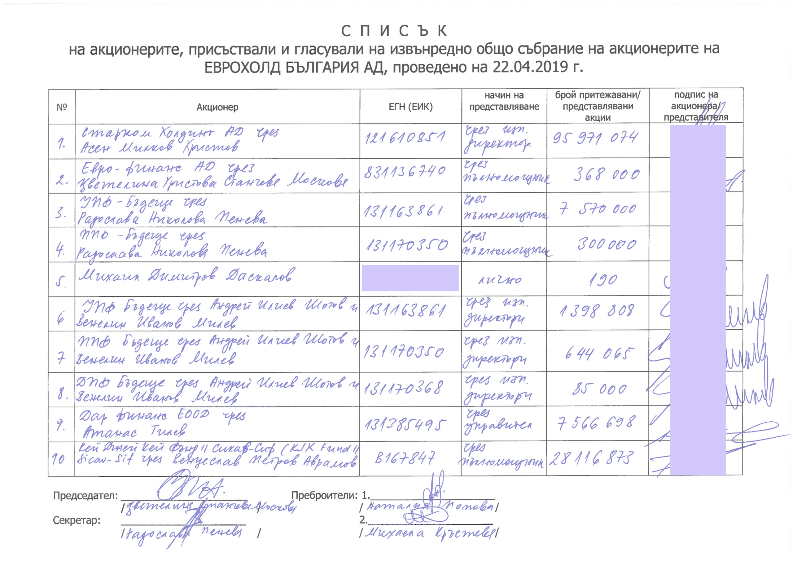 - Разпечатка от акционерната книга на “Еврохолд България” АД