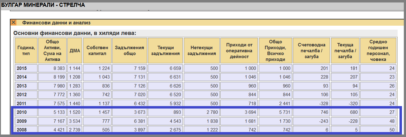 От данните, с които работи информационната система “Сиела Инфо”, през периода 2009 – 2011 г. “Булгар Минерали Стрелча” инкасира следните резултати: