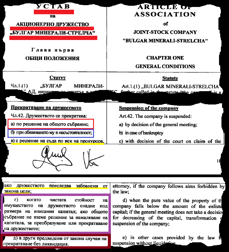 Ако италианците не искаха да сложат ръка на фирмата, а просто да се разделят с Люба Кожухарова и Георги Симеонов, те спокойно можеха да прибегнат до услугите на устава, който са подписали още през лятото на 2008 г. и в който черно на бяло са изброени пет опции за прекратяване на АД-то:
