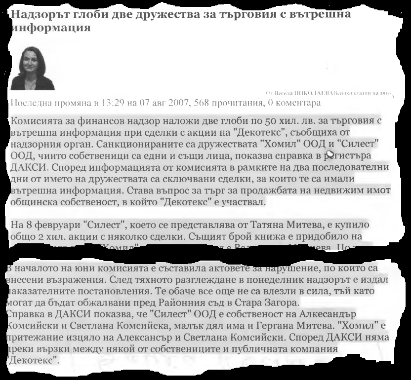 Справка в ДАКСИ показва, че “Силест” ООД е собственост на Алкесандър Комсийски и Светлана Комсийска, малък дял има и Гергана Митева. “Хомил” е притежание изцяло на Адексансър и Светлана Комсийски. Според ДАКСИ няма преки вързки между някой от собствениците и публичната компания “Декотекс”…”
