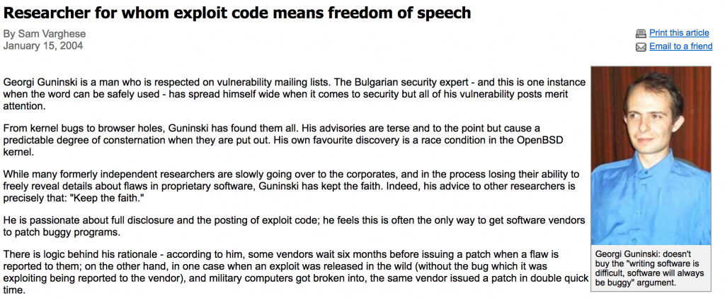 Георги Гунински е роден през 1972 г. и учи за финансист в софийския УНСС, но се ориентира към компютърната сигурност. Той придобива световна известност като “бял хакер”, откривайки и публикувайки информация за десетки критични уязвимости в различни операционни системи и браузъри. През 2004 г. попада в класация на най-добрите експерти по компютърна сигурност, редом с Фил Цимерман, Брюс Шнайер и други световни светила.