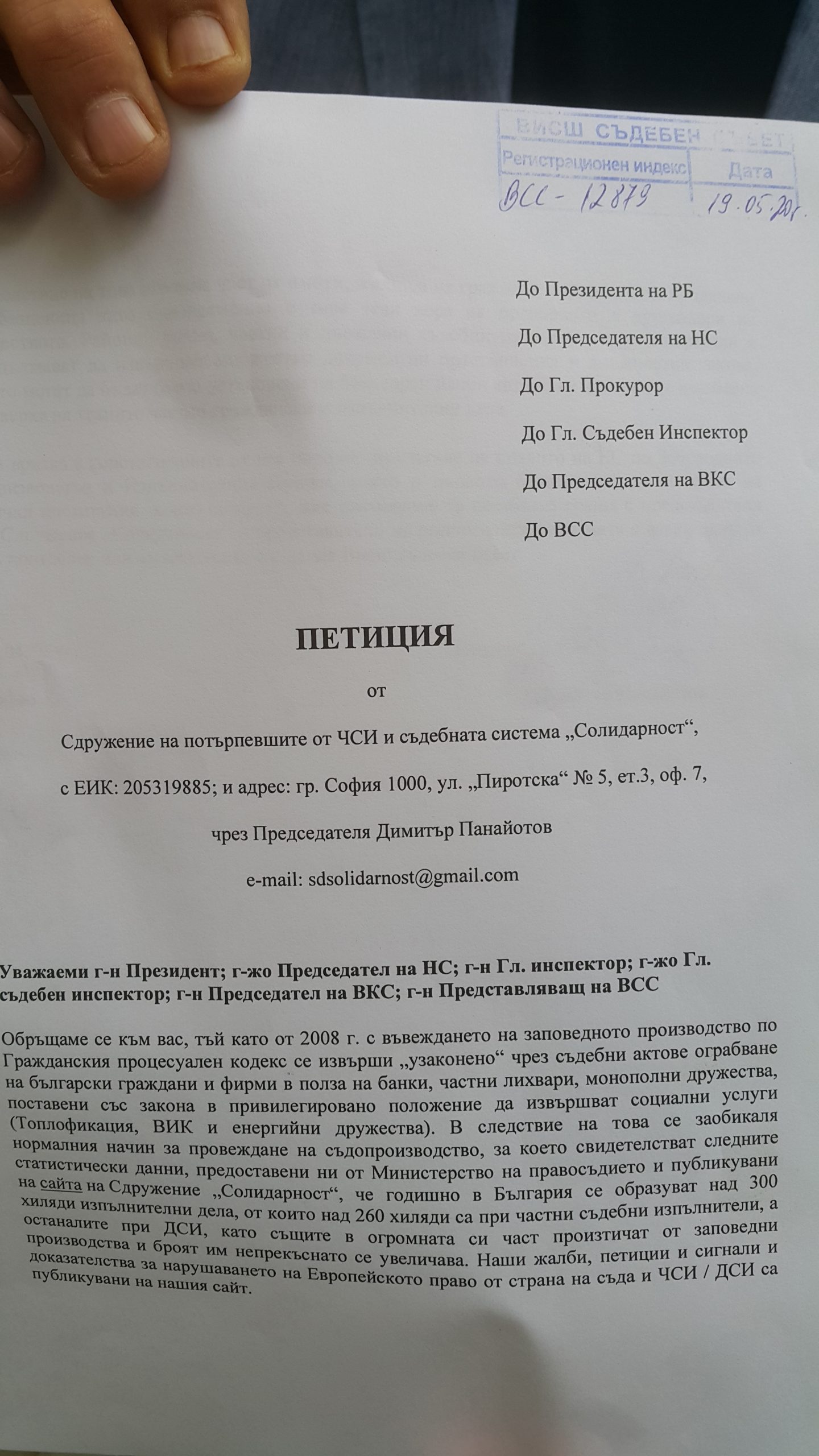 Във връзка с констатираните от нас порочно прилагане на правото на ЕС по Заповедното Производство и Изпълнителния Процес, както и пълното бездействие до момента на всички институции, които сезираме, ние настояваме за незабавна среща с представители от Сдружение „Солидарност“ и представители на подписалите петицията с всеки един от Вас поотделно или заедно, както и с целия висш съдебен съвет”, гласи петицията до Румен Радев.